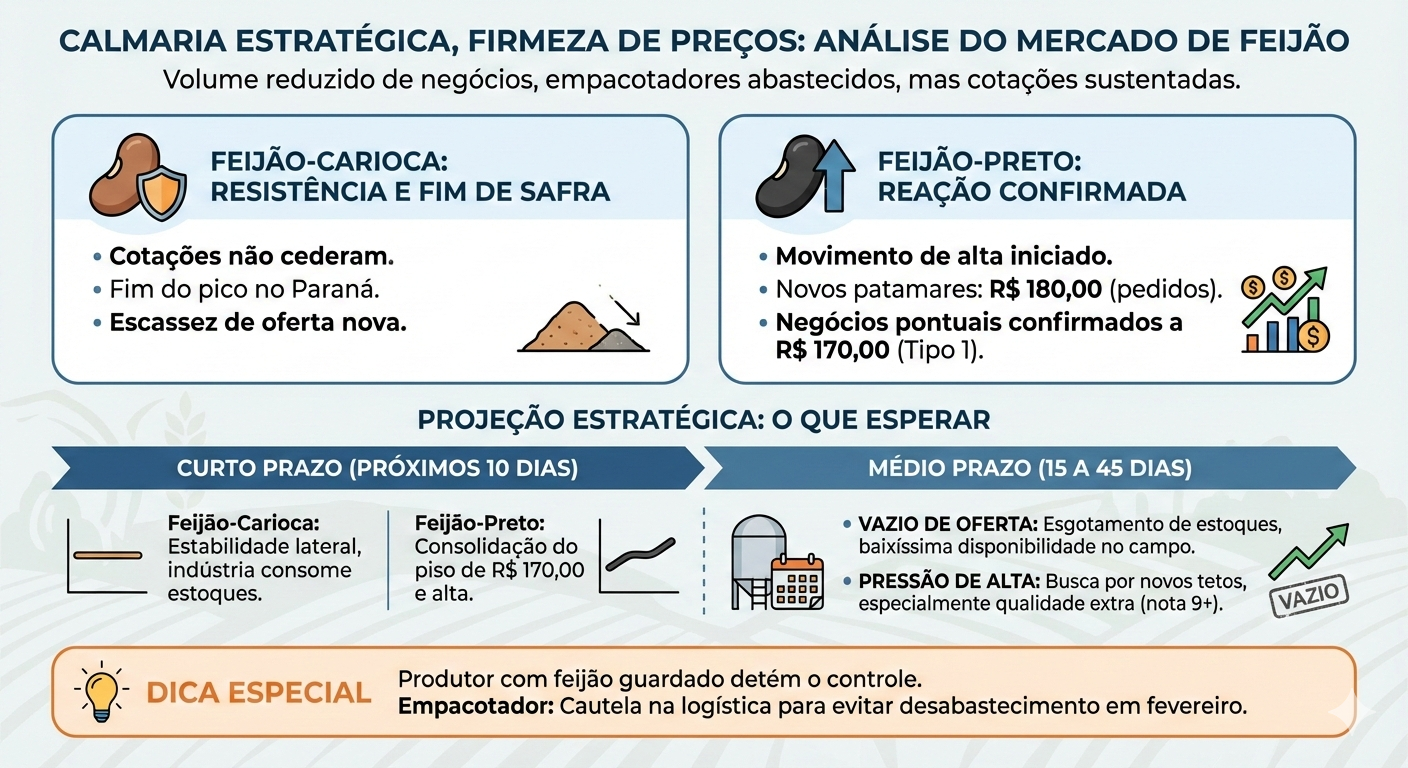 No Paraná, quem necessita de Feijão-preto enfrenta dificuldades crescentes para atender à demanda por qualidade. Para ajudar os produtores, os cerealistas têm buscado negociar o Feijão de qualidade inferior com cestas básicas ou marcas com menor exigência de qualidade, uma vez que ele apresenta um alto percentual de grãos brotados, despeliculados e impregnados.