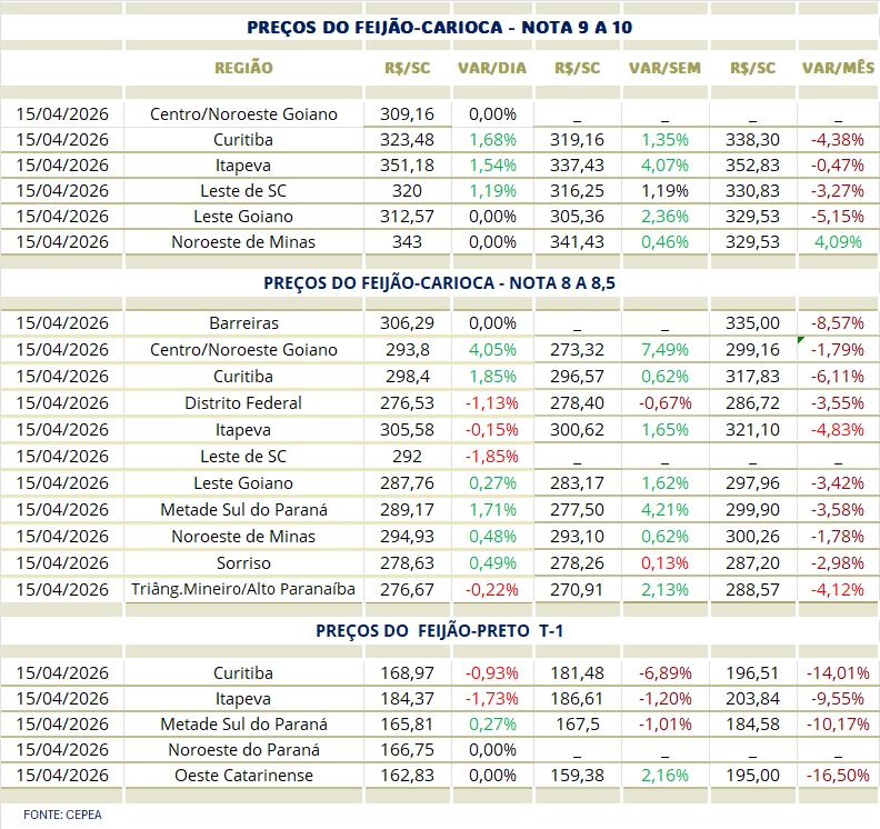 Em Minas Gerais, a referência no físico passou por Feijão nota 8 a R$ 300, nota 8,5 entre R$ 320 e R$ 330, e uma única carreta de nota 9 negociada a R$ 345. O dado conversa diretamente com o CEPEA desta quarta-feira, 15 de abril, que apontou o Feijão-carioca nota 9 ou superior no Noroeste de Minas a R$ 343,00/sc, estável no dia. No padrão nota 8 e 8,5, o CEPEA mostrou Noroeste de Minas a R$ 294,93/sc, alta diária de 0,48%.