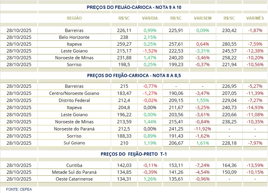 Ontem, diversos produtores relataram maior interesse por parte de empacotadores, mas ainda sem reflexo em todas as praças. Para que os negócios avançassem, mesmo em Feijões-carioca comerciais nota 8, o valor precisou ficar entre R$ 5 e R$ 10 por saca acima do praticado no fim da semana passada. No quadro mais amplo, não há motivo de alarme específico para o setor do Feijão; porém, o comércio de alimentos em geral sente os efeitos da SELIC mais alta — exatamente o objetivo da política: esfriar o consumo de tudo. O cliente que antes ia ao supermercado com mais opções passa a optar por alternativas mais acessíveis. Sem dinheiro na mão, recorre ao cartão de crédito, movimento que segue em alta segundo o setor financeiro, ainda que traga riscos para o consumidor.