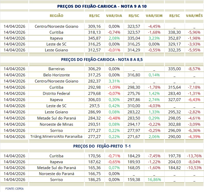 No CEPEA desta terça, o Feijão-carioca peneira 12 e/ou nota 9 ou superior foi indicado a R$ 318,13/sc em Curitiba. Mas isso está fora da realidade. Em Curitiba não se planta Feijão-carioca; ali, as fontes devem ser empacotadores ou comerciantes que citam o que gostariam de estar recebendo de algum lugar.