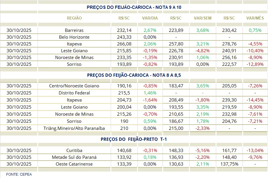 A semana deve encerrar com estabilidade nos preços e pouca liquidez. O foco do mercado volta-se para o clima e para a confirmação das perdas efetivas no Paraná — que podem definir o comportamento do Feijão até o final do ano.