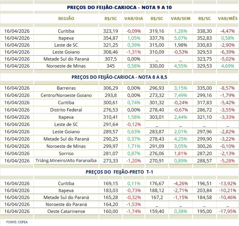 O CEPEA também ajuda a confirmar essa leitura. Nesta quinta-feira, 16 de abril, o Feijão-carioca nota 9 ou superior apareceu a R$ 345/sc no Noroeste de Minas, R$ 323,19 em Curitiba e R$ 307,50 na Metade Sul do Paraná. Nas notas 8 e 8,5, a Metade Sul do Paraná ficou em R$ 290,25 e o Noroeste de Minas em R$ 299,97. Esses valores para 8/8,5 indicam que o Feijão nota 9 não tem oferta, e o jeito é se contentar com o melhor disponível dentro desse parâmetro de cor.