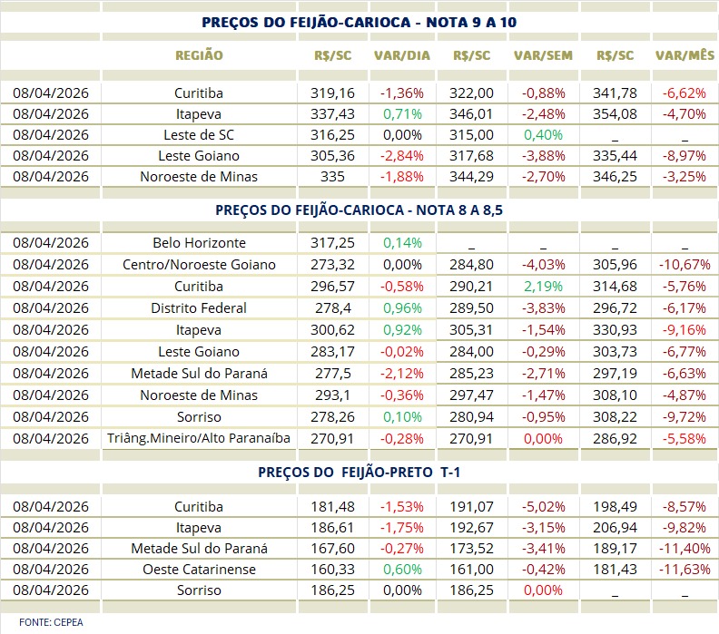 A imagem abaixo dispensa maiores comentários. Fica fácil perceber a diferença na quantidade de lotes disponíveis entre abril de 2025 e abril deste ano. As fotos, cedidas por um corretor da região de Unaí, ajudam a explicar por que os valores seguem estáveis, mesmo com volumes menores sendo negociados. Estamos falando da principal região produtora de Feijão-carioca do Brasil.